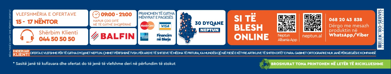 Në 30 dyqane, duke telefonuar në +355 44 50 50 50 ose online