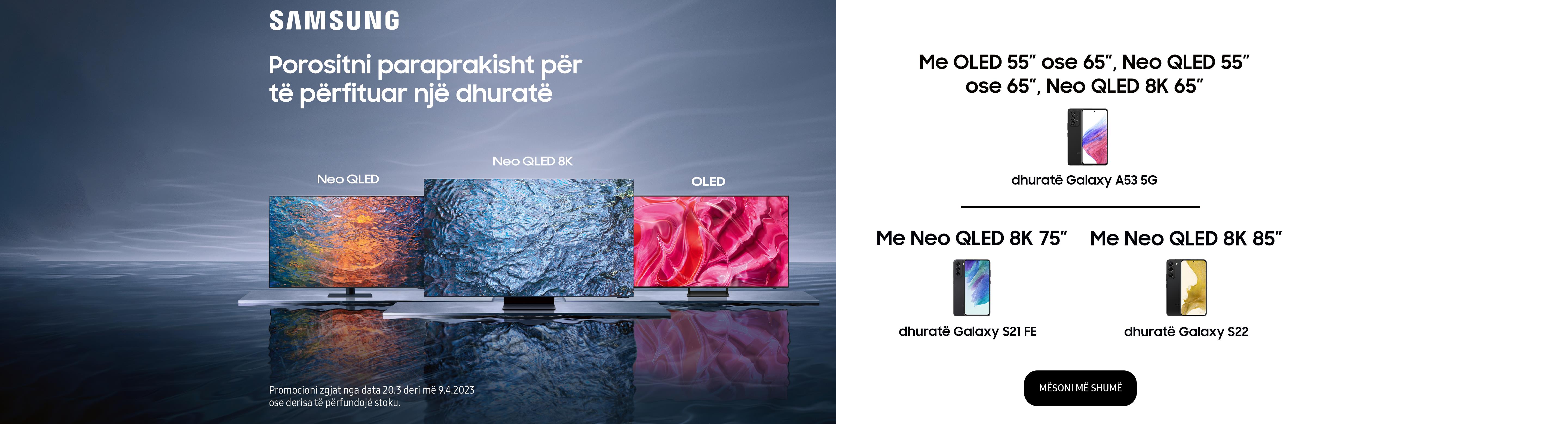 Të gjithë blerësit që porosisin paraprakisht OLED 55" ose 65", Neo QLED 55" ose 65" ose Neo QLED 8K nga 65" brenda periudhës së promocionit nga data 20/3 deri më 9/4/2023** do të përfitojnë Galaxy A53 5G*** dhuratë.